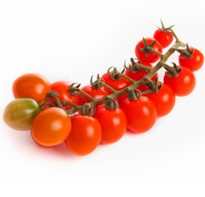 Lycopersicon esculentum. Familia de las Solanáceas. Hortalizas de fruto. Ingrediente universal. Se nos presenta en su rama original pudiendo tener hasta veinte piezas. Fruto esférico casi perfecto de color rojo brillante y dureza optima. Pulpa roja con semillas. Ligero sabor ácido que se compensa con su particular sabor dulce.